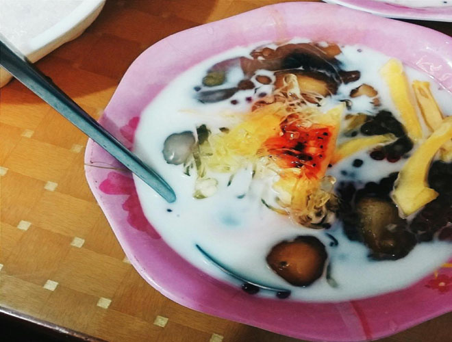 Chè chợ Đồng Xuân có rất nhiều loại như chè đỗ đen, chè thập cẩm, chè bưởi,... nhưng nổi tiếng hơn cả là chè xuka (lấy tên một nhân vật hoạt hình chủ quán ưa thích). Chè xuka là sự kết hợp hoàn hảo của các nguyên liệu thơm ngon và đầy màu sắc: caramen trắng mềm, thơm ngậy; những miếng thạch đen bóng loáng; một chút thạch rau câu xanh mát; long nhãn ngọt lịm cùng thạch trân châu giòn, thạch lựu đỏ và rưới lên trên là nước cốt dừa ngọt ngào, thơm nức... Ảnh: Linh Nguyễn.