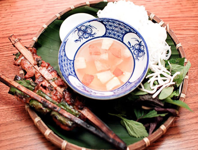 Ngõ chợ Đồng Xuân là một trong số ít nơi bán chả que tre ở Hà Nội. Món bún chả ở đây được làm theo phong cách cổ truyền: chả bọc lá lốt, kẹp que tre nướng trên than hoa. Thịt lợn ngọt quyện với vị thơm của lá lốt, hành phi và mùi dân dã của tre ám khói. Ngoài ra, điểm độc đáo nữa của quán là bún chả ở đây được ăn với giấm me, giấm sấu nên có vị khác biệt hẳn. Với 35.000 đồng, bạn đã có ngay một bát bún chả đầy đặn bún với 2 que chả miếng, 2 que chả băm lá lốt. Ảnh: Blogphuot.vn.