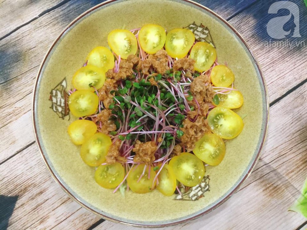 Trộn đều hỗn hợp nước xốt lên vào tô rau củ, cho ra đĩa, rưới cá ngừ lên trên và thưởng thức.