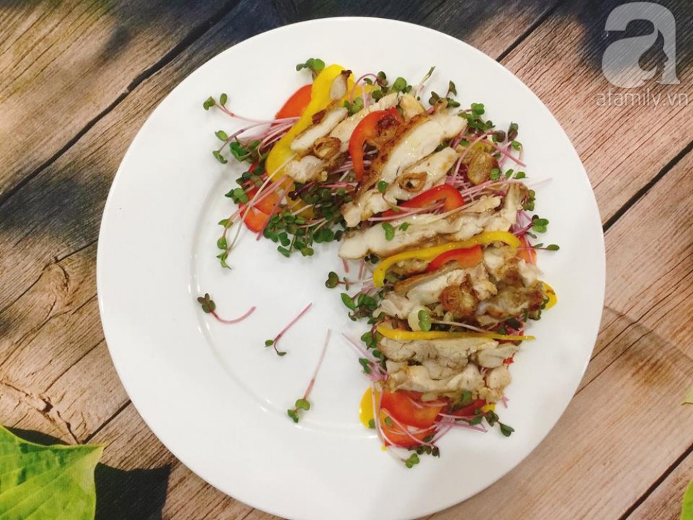 Khi ăn xếp rau mầm và ớt chuông xuống dưới, xếp gà lên trên, rưới nước xốt và rắc hành khô phi vàng vào.