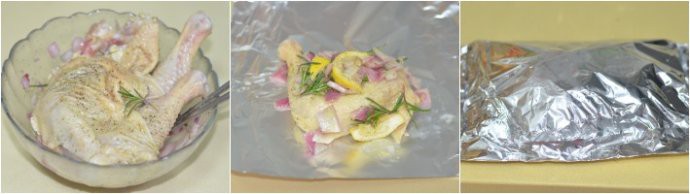 Bật lò nướng ở 200 độ C trước 10 phút. Xếp gà lên khay nướng đã lót sẵn giấy bạc, sau đó bọc kín lại. Đem nướng khoảng 20 phút ở rãnh giữa của lò nướng, sau đó hạ khay xuống rãnh thấp nhất rồi nướng thêm 18 phút nữa là được.