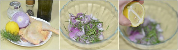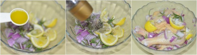 Cắt miếng to bản hành tây, xé nhỏ lá hương thảo sau đó vắt 1/2 chanh vào hỗn hợp hành tây và lá hương thảo. 1/2 quả chanh còn lại thái lát mỏng rồi cũng cho vào hỗn hợp.